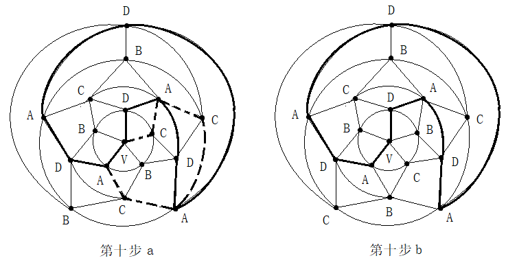 第二步:在五轮图围栏新形成的A一D环(通过空白区0)外进行B与C二色互换,形成新的A一C环(通过0区)。见图10。
