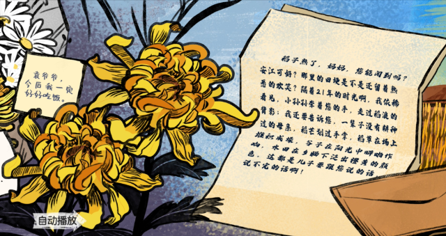 长卷尾声,袁隆平离世前家人们围绕在他身边,唱起他最爱的歌曲的画面真切再现。他写给妈妈的那封信更是感人至深:“稻子熟了,妈妈,您能闻到吗……稻草在场上堆积成垛,谷子在阳光中噼啪作响,水田在夕晒下泛出橙黄的颜色。这都是儿子要跟您说的话,说不完的话啊!”