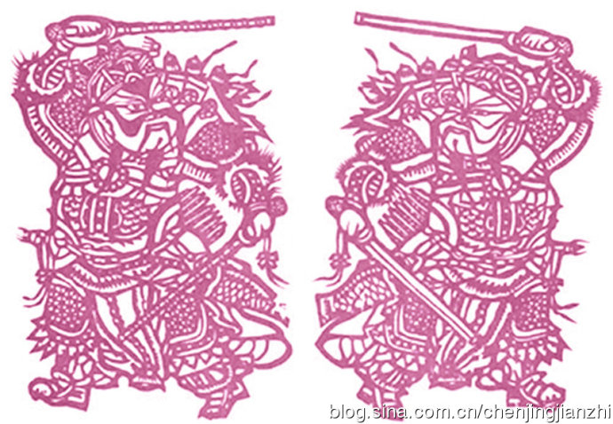中国广大地区仍流行贴门神驱鬼的风俗。门神为旧时民间信仰的五位家神之一,传说中把守门户之神。最早的门神起源于上古时荼(神荼)与郁(郁垒)的神话传说。到汉魏时,改为门户画桃符、神荼、郁垒与虎。唐时,门神形象改为秦琼和尉迟敬德。唐后期,又借钟馗捉鬼之传说,将其附会门神张贴。民间春节贴挂的门神多为木印版画和剪纸。形象有神荼和郁垒、秦琼和尉迟敬德、钟馗、桃符、虎等。正门贴神荼和郁垒或秦琼和尉迟敬德。因为钟馗、桃符、虎像是单幅,一般人家大都把它们贴在单扉的堂门、房门、后门。明清时代,除了先世流传下来的武将门神外,还出现了文官的“财神”、“福神”、“福禄寿三星”或“五路财神”,“增福财神”作为大小门神。这已从消极的驱鬼逐崇演化为积极的纳福迎祥。