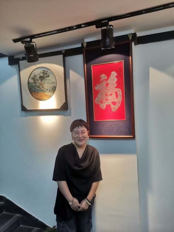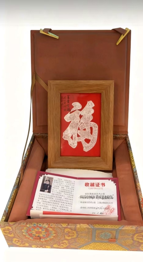 《富贵有福》的惊艳之处,首先在于其对“中国红”的极致运用。中国红,是中国人心中最具代表性的色彩,象征着喜庆、吉祥与富贵,而将其融入瓷板画创作,难度极高。陈丽华老师团队经过多次试验,最终选用高品质红瓷为底,让瓷板呈现出温润而浓郁的红色,如同烈火淬炼后的宝石,既有着瓷器的细腻质感,又饱含着东方美学的大气磅礴。更令人称道的是,作品以非遗“掐丝描银”工艺为脉络,陈丽华老师以细如发丝的银线为笔,在红瓷底上精心勾勒,每一道银线的弧度、每一处掐丝的力度,都经过反复打磨。银线交织间,满幅“福”韵悄然绽放,与中国红交相辉映,既有传统工艺的精致,又有现代审美的大气。